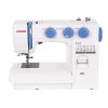 A máquina conta com funções que auxiliam na costura, como botão para arremate automático, botão para costura de retrocesso e botão para subir e descer a agulha.